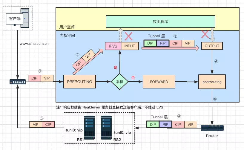 Tunnel 模式在国内使用的比较少,不过据说腾讯使用了大量的 Tunnel 模式。它也是一种单臂的模式,只有请求数据会经过 lvs,响应数据直接从后端服务器发送给客户端,性能也很强大,同时支持跨机房。下边继续看图分析原理。