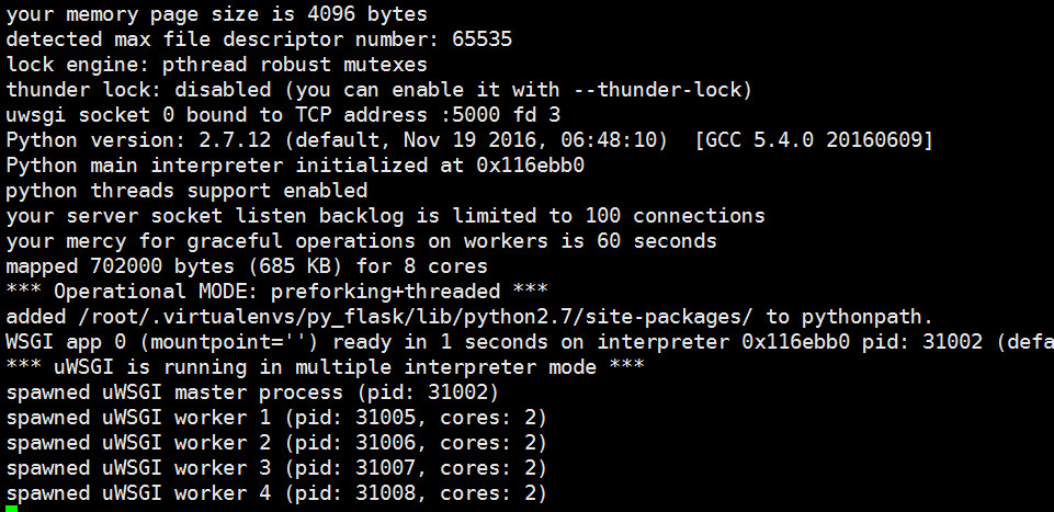 #需要声明uwsgi使得uwsgi能够识别当前文件 [uwsgi] master = true # 使用 nginx 配合连接时使用 socket = :5000 # 直接做web服务器使用 #http = :5000 # 设定进程数 processes = 4 # 设定线程数 threads = 2 # 指定运行的文件 wsgi-file = test2.py #指定运行的项目的目录[自已项目在哪个目录就用哪个目录] chdir = /root/Flask_day3 # 指定运行的实例 callable = app # 指定uwsgi服务器的缓冲大小 buffer-size = 32768 # 在虚拟环境中运行需要指定python目录 pythonpath = /root/.virtualenvs/py_flask/lib/python2.7/site-packages # 设置进程id文件 pidfile = uwsgi.pid # 以守护的形式运行,设置log输出位置 #daemonize = uwsgi.log