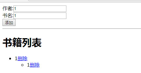 <!DOCTYPE html> <html lang="en"> <head> <meta charset="UTF-8"> <title>Title</title> </head> <body> <form method="post"> {{ add_book_form.csrf_token() }} {{ add_book_form.author_name.label }}{{ add_book_form.author_name }}<br/> {{ add_book_form.book_name.label }}{{ add_book_form.book_name }}<br/> {{ add_book_form.submit }}<br/> {% for message in get_flashed_messages() %} {{ message }} {% endfor %} </form> <hr> <h1>书籍列表</h1> <ul> {% for author in authors %} <li>{{author.name}}<a href="/delete_author/{{ author.id }}">删除</a></li> <ul> {% for book in author.books %} <li>{{ book.name }}<a href="/delete_book/{{ book.id }}">删除</a></li> {% endfor %} </ul> {% endfor %} </ul> </body> </html>