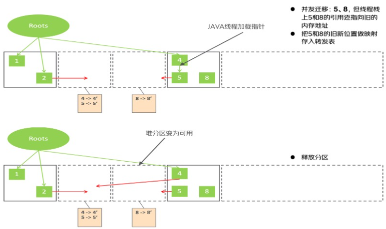 - 标记阶段确定存活对象后,GC线程与应用线程并发复制对象到新Region。
