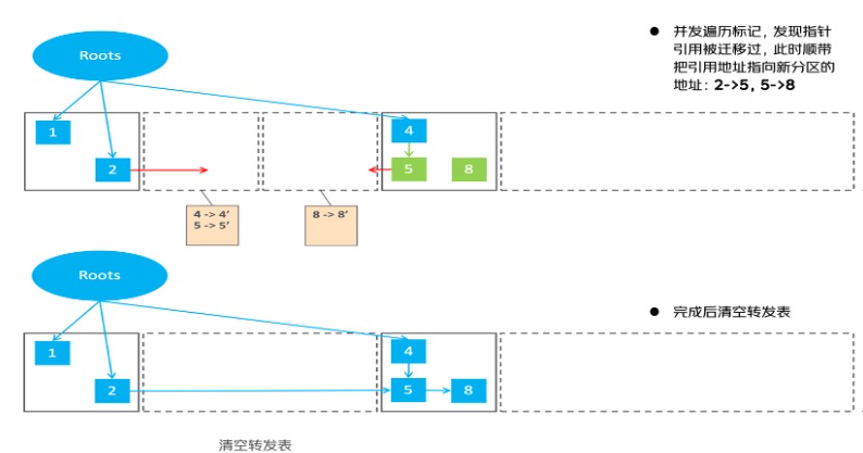 - 转发表(Forwarding Table):记录对象转移后的新地址,支持并发转移
