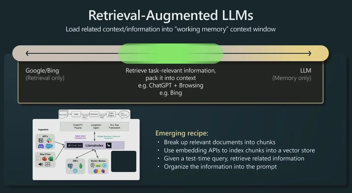 OpenAI 研究科学家 Andrej Karpathy 前段时间在微软 Build 2023 大会上做过一场关于 GPT 模型现状的分享 State of GPT,这场演讲前半部分分享了 ChatGPT 这类模型是如何一步一步训练的,后半部分主要分享了 LLM 模型的一些应用方向,其中就对检索增强 LLM 这个应用方向做了简单介绍。