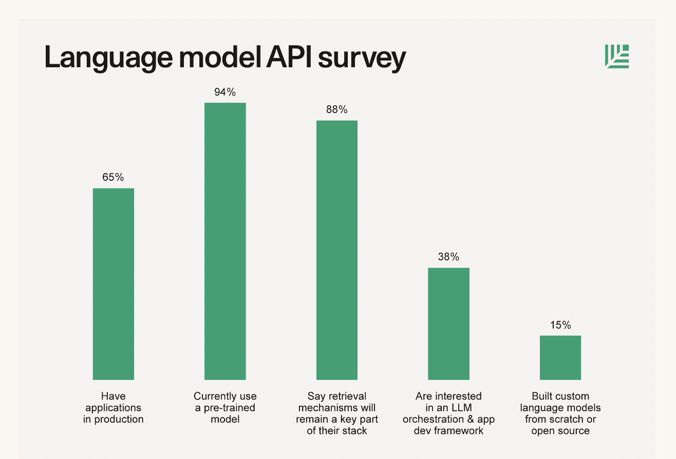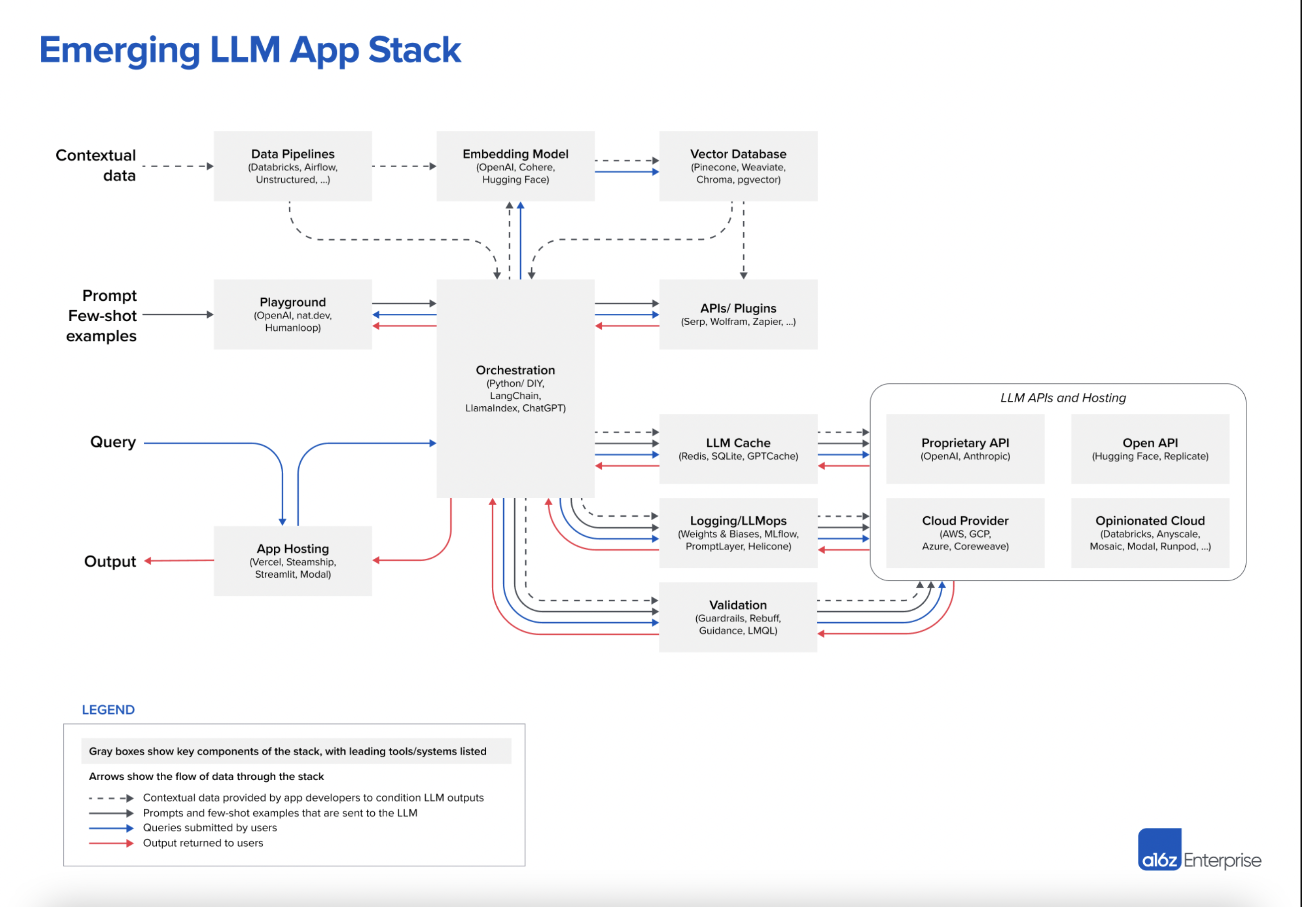 不仅 Andrej 的分享中提到基于检索来增强 LLM 这一应用方式,从一些著名投资机构针对 AI 初创企业技术栈的调研和总结中,也可以看到基于检索来增强 LLM 技术的广泛应用。