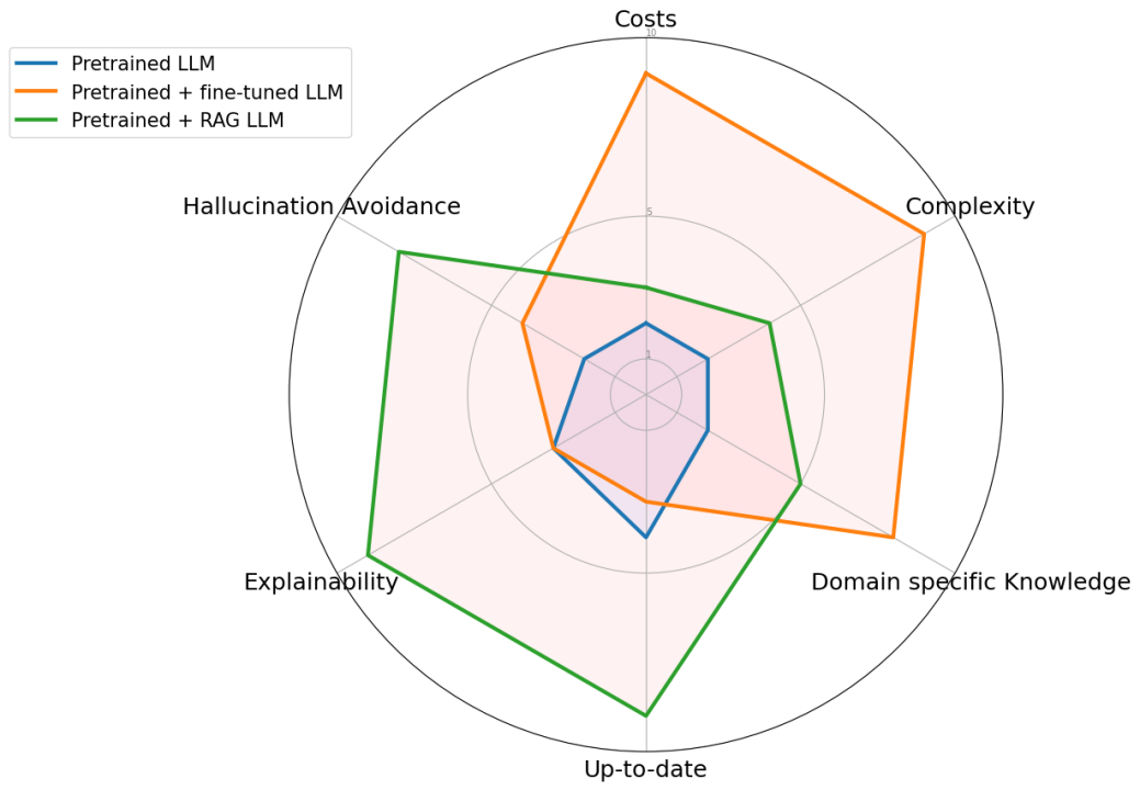 雷达图具体比较了三种不同的方法:预训练大语言模型、预训练 + 微调 LLM 、预训练 + RAG LLM。