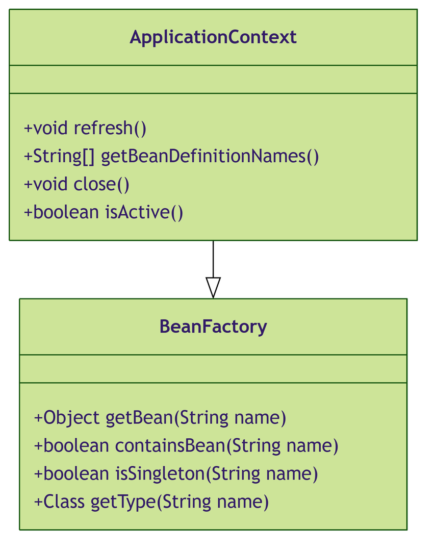 可以理解成简单容器,Spring 最基础的 IoC 容器接口,采用 延迟加载 (Lazy Loading),提供最核心的 Bean 管理功能(创建、依赖注入、生命周期管理)。它仅关注 Bean 的实例化和配置,不支持企业级特性。