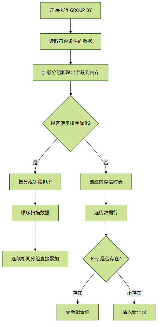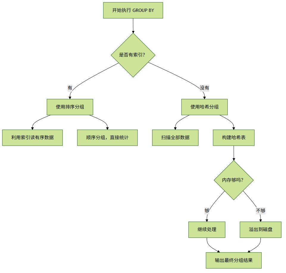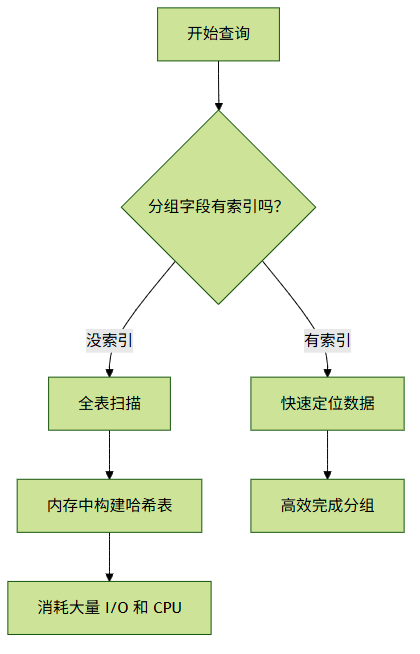若分组字段存在索引,MySQL 会利用索引的有序性直接分组,避免显式排序。