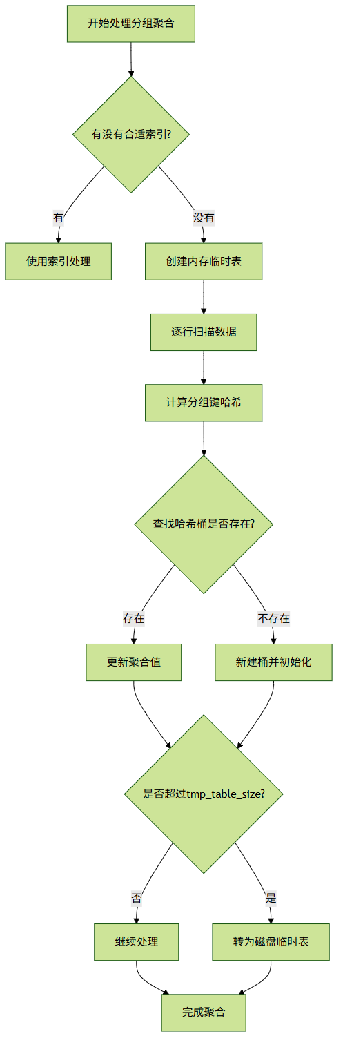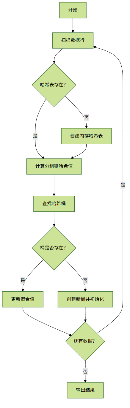 步骤:扫描全量数据 → 在内存中构建哈希表(键为分组字段,值为聚合结果) → 若内存不足则溢出到磁盘 → 最终输出分组结果。
