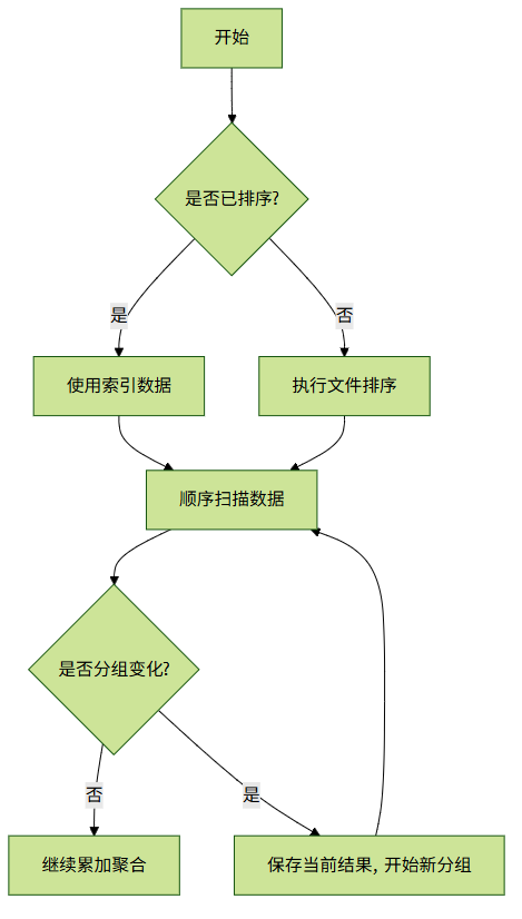 步骤:通过索引扫描有序数据 → 按顺序直接分组 → 无需额外排序。