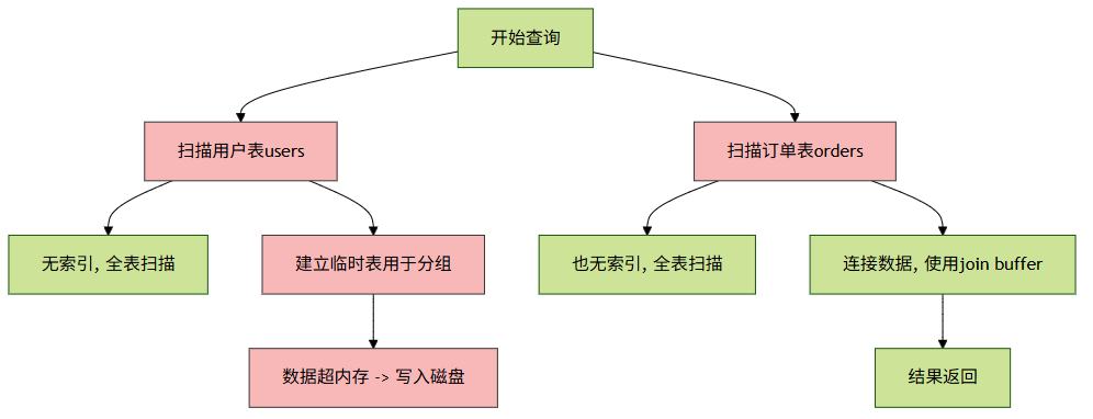 表(订单表)也没有索引,也是全表扫- 使用了临时表和连接缓冲区(Using join buffer),效率低