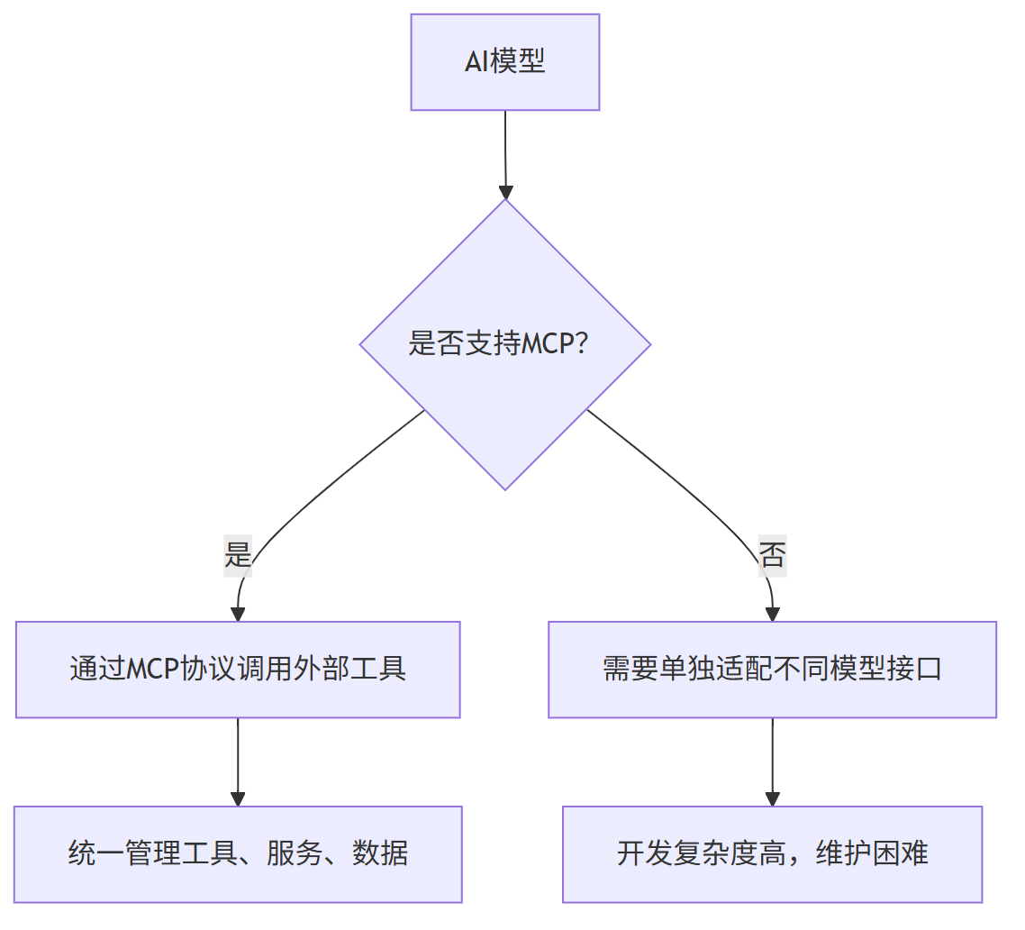 为了解决这个问题,MCP被提出来作为一个通用标准协议,让不同模型都能通过统一的方式访问外部工具和服务。