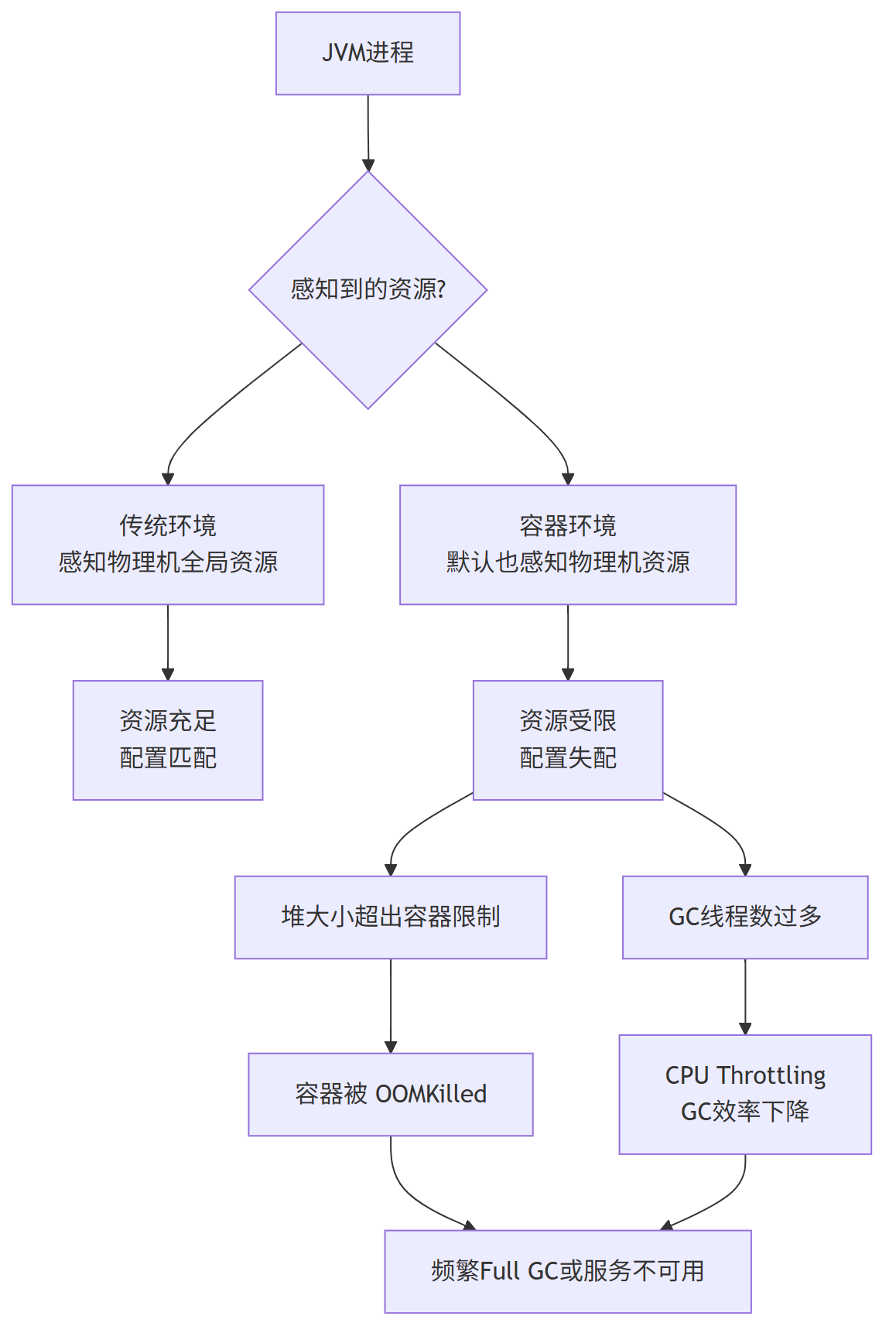 1、资源限制与感知:JVM默认感知的是物理机的资源上限,而非容器的CPU/Memory Limit。这会导致: