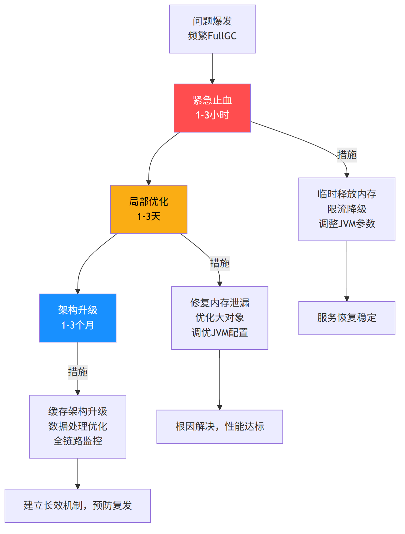 需分 “紧急止血→局部代码优化 与 JVM 优化→ 架构升级” 三个大步骤,确保问题彻底解决。