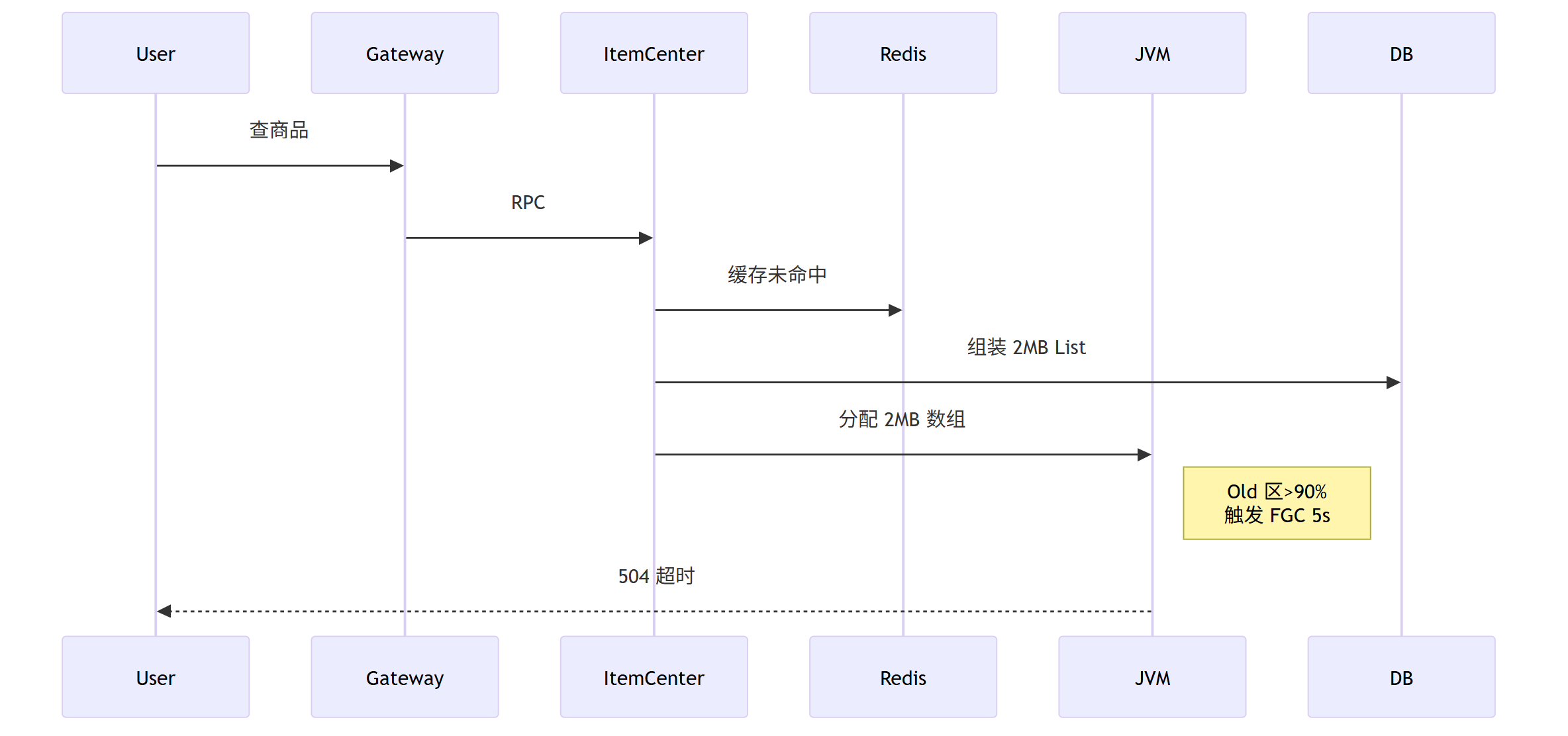 缓存未命中时DB查询 返回全字段,平均对象 2MB,每秒 3000 次 → 6GB/min 进入 Old 区