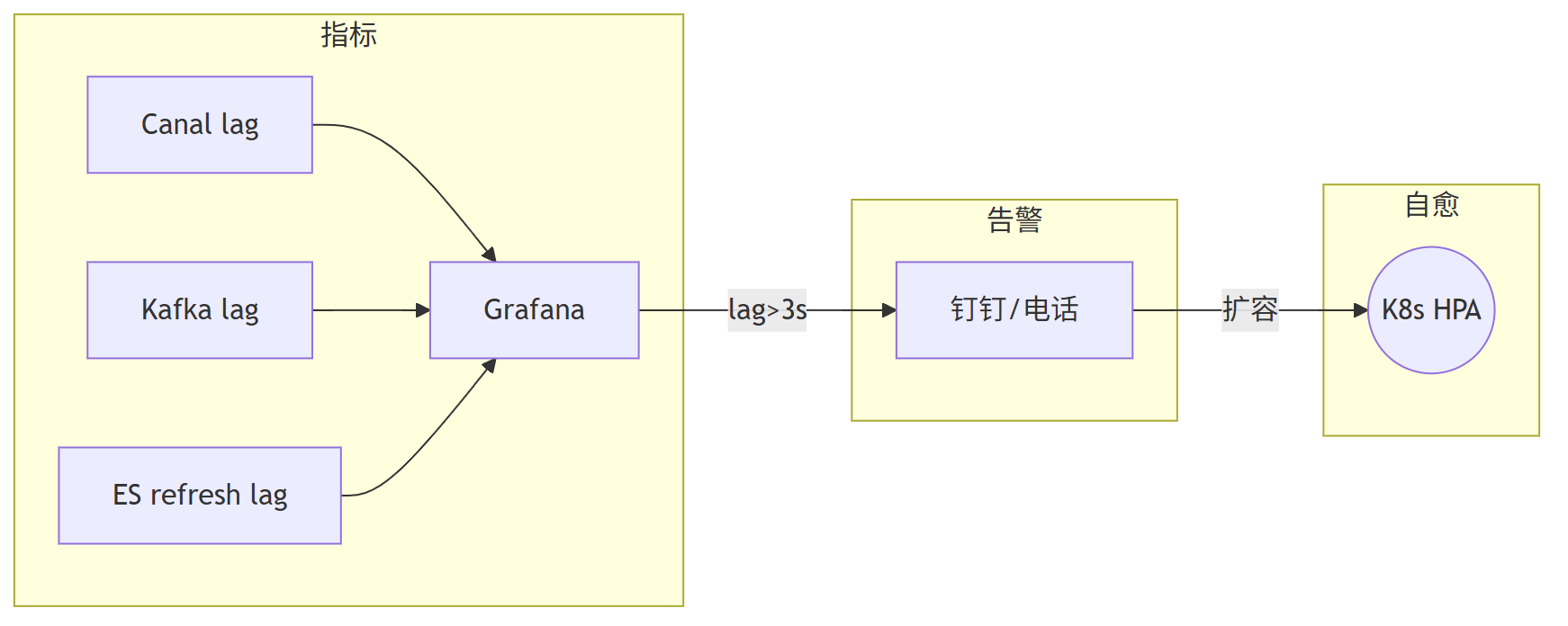 需要监控Canal延迟、Kafka堆积情况、ES刷新延迟等关键指标,并通过Grafana进行可视化展示。