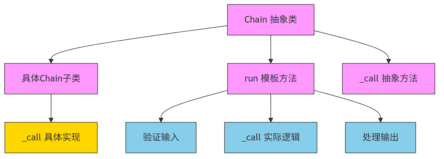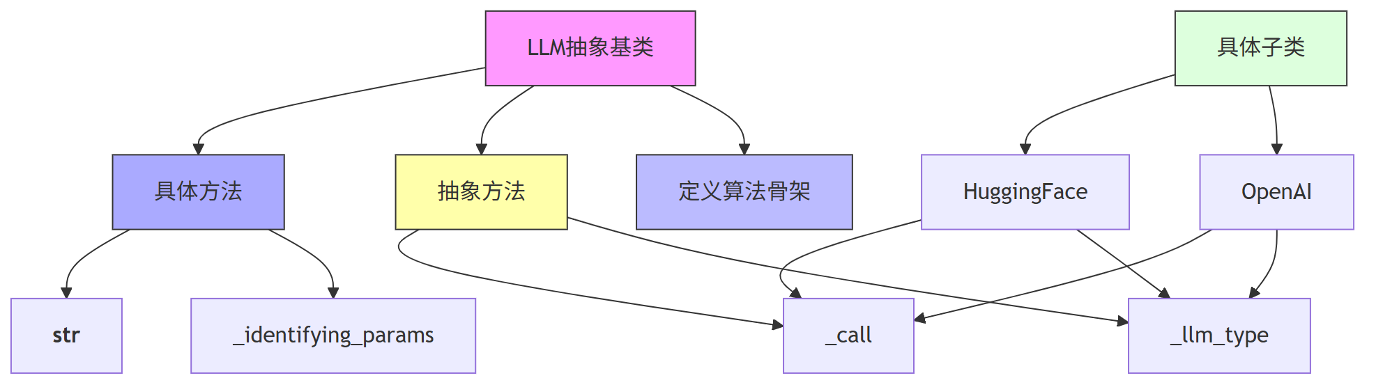 在我们这段代码中,LLM 类是一个抽象基类(Abstract Base Class),它定义了所有语言模型(如 OpenAI、HuggingFace 等)必须遵循的接口。这个类中定义了抽象方法(_llm_type 和 _call)和一些默认实现的方法(如 __str__ 和 _identifying_params),这正是模板方法模式的典型应用。