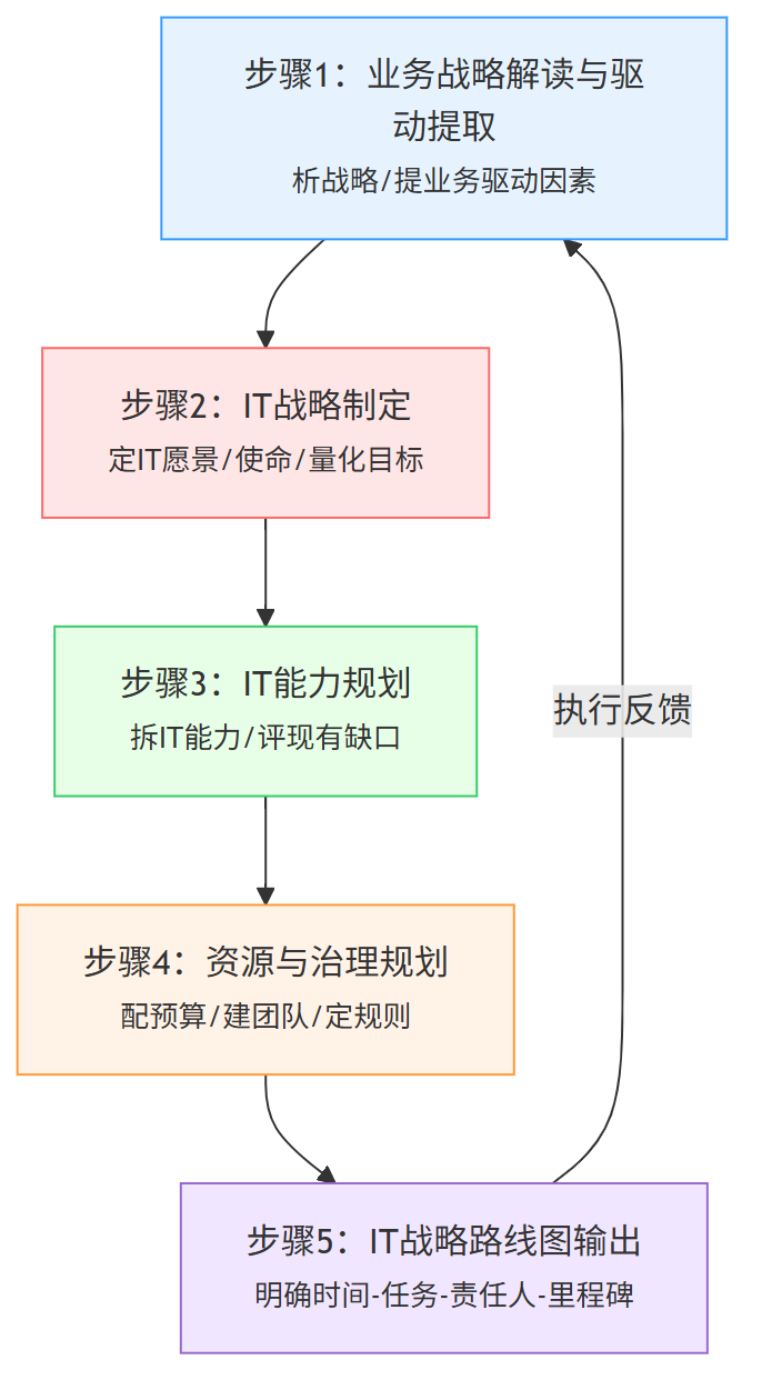 输出:《IT战略规划书》(含愿景、使命、量化目标)。