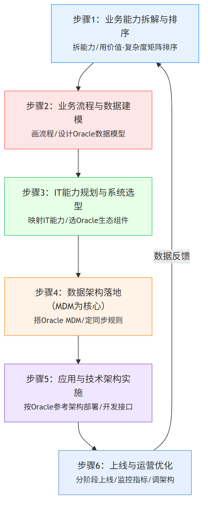 将业务能力转化为IT能力(如“合规管理”→“资质审核系统”“追溯系统”),结合Oracle生态选型(如用OracleIntegrationCloud实现系统集成),评估现有系统是否可复用(如现有ERP是否支持合规数据录入);