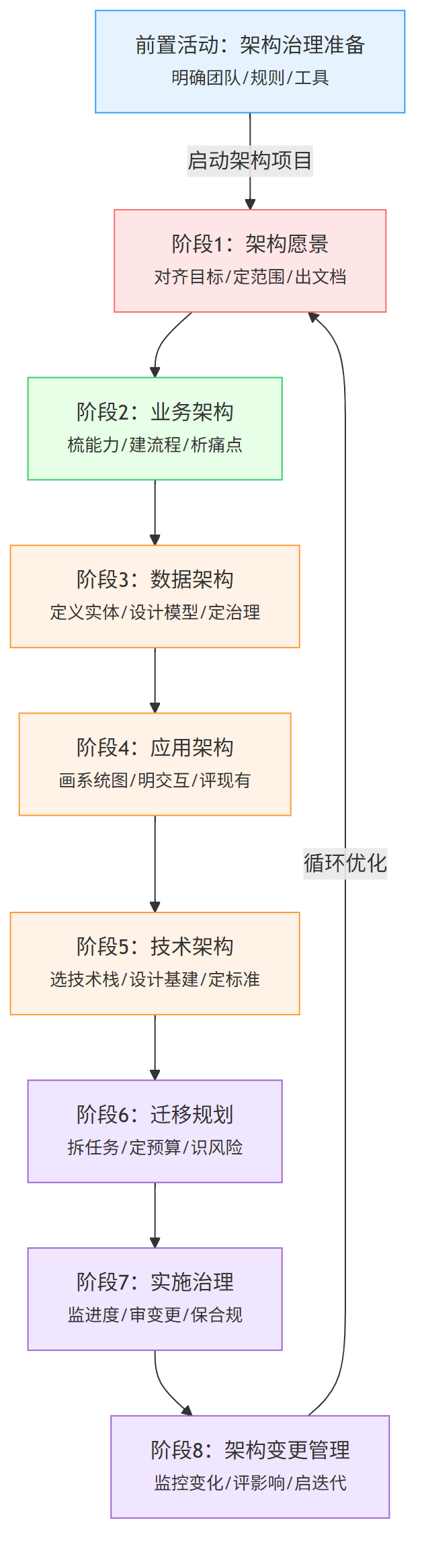 蓝色(前置活动)→ 红色(愿景定义)→ 绿色(业务架构)→ 橙色(数据 / 应用 / 技术架构)→ 紫色(迁移 / 实施 / 变更),对应 “准备→设计→落地→优化” 全循环。