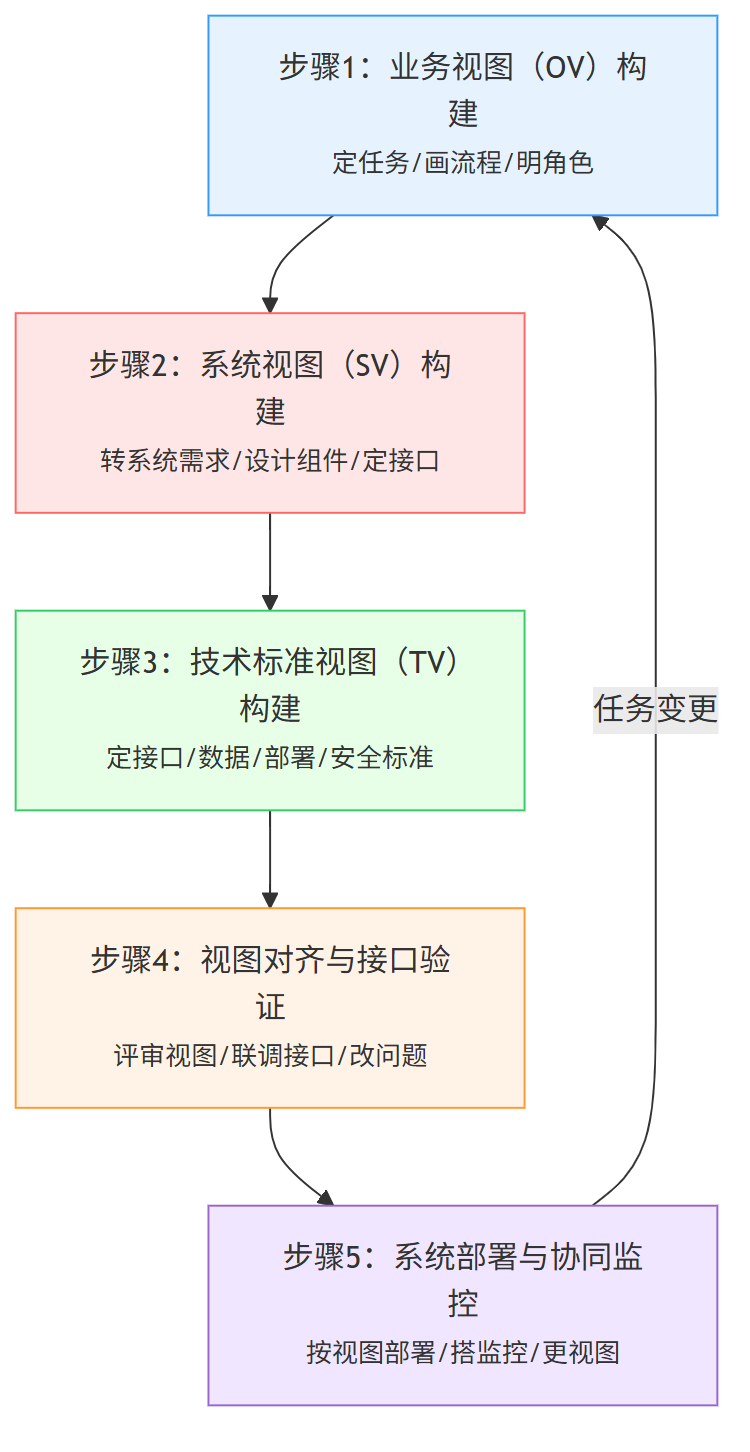 输出:《业务视图文档》(含OV-1任务愿景图、OV-2流程表、OV-4角色关系图)。