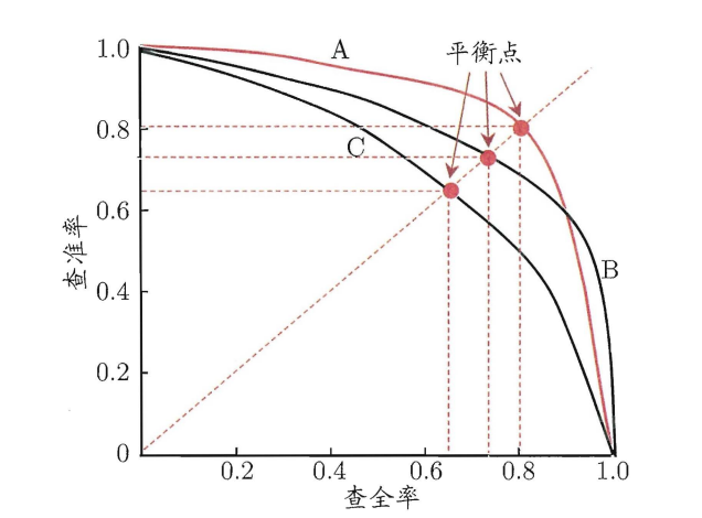 "平衡点“($Break-Event Point \(,简称\)BEP\()就是这样一个度量,它是" 查准率=查全率"时的取值。基于\)BEP\(的比较,可认为学习器\)A\(优于\)B$。