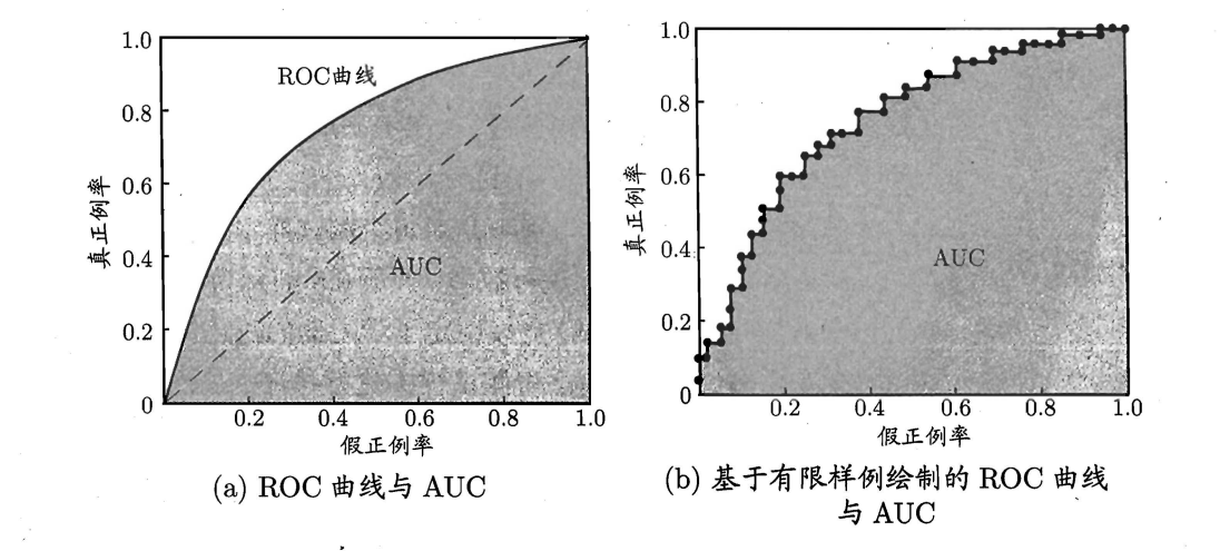 \(AUC\)(\(Area\) \(Under\) \(ROC\) \(Curve\)) :一个学习器的\(ROC\)曲线被另学习器的曲线完全"包住",则可断言后者的性能优于前者;若两个学习器\(ROC\)曲线发生交叉,则难以一般性地断言两者孰优孰,此时如果一定要进行比较则较为合理的判据是比较\(ROC\)线下的面积\(AUC\)。