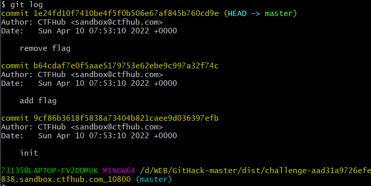GitHack一把梭,把东西弄下来,在文件夹内执行git命令:git log: