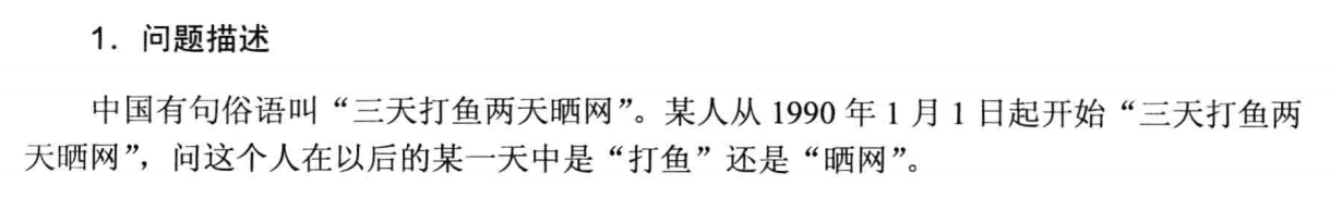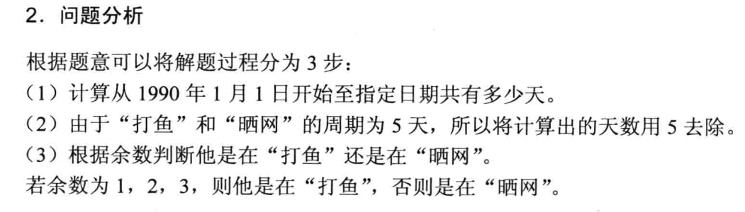 #include<iostream> using namespace std; int main(){ int year,month,day,sum,s=0,i,q; cin>>year>>month>>day; int a[13]={0,31,28,31,30,31,30,31,31,30,31,30,31}; if((year%4==0&&year%100!=0)||(year%400==0)) { a[2]=29; } if((year-1990)%4<3){ sum=((year-1990)/4)*1461+(year-1990)%4*365; } else { sum=((year-1990)/4)*1461+(year-1990)%4*365+1; } for(i=1;i<month;i++){ s+=a[i]; } q=sum+s+day; if(q%5<4&&q%5>0) cout<<"今天打鱼"; else cout<<"今天晒网"; cout<<q; return 0; }