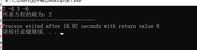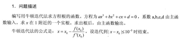 #include<iostream> #include<cmath> using namespace std; int main(){ float a,b,c,d,x0,f,f1; cin>>a>>b>>c>>d; float x=2.0; while(fabs(x-x0)>=1e-5){ x0=x; f=a*x0*x0*x0+b*x0*x0+c*x0+d; f1=3*a*x0*x0+2*b*x0+c; x=x0-f/f1; } cout<<"所求方程的跟为:"<<x; return 0; }