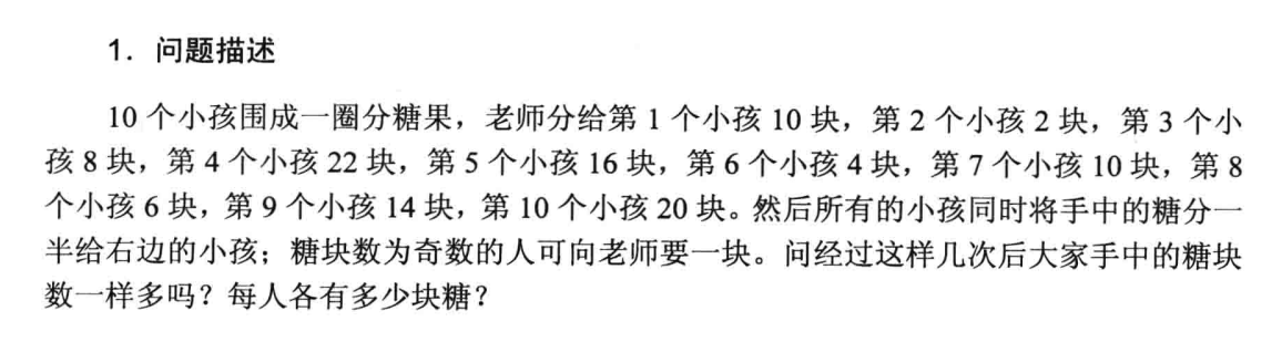 #include<iostream> using namespace std; int judge(int *c){ int i,s=0; for(i=2;i<11;i++){ if(c[1]!=c[i]) s=1; } return s; } int main(){ int sweet[12]={20,10,2,8,22,16,4,10,6,14,20,0}; int i,j=1; // cout<<sweet[10]; while(judge(sweet)){ // cout<<judge(sweet); for(i=11;i>0;i--){ sweet[0]=sweet[10]; if(sweet[i-1]%2==0){ sweet[i]+=(sweet[i-1]/2); sweet[i-1]=sweet[i-1]/2; } else{ sweet[i]=sweet[i]+(sweet[i-1]+1)/2; sweet[i-1]=(sweet[i-1]+1)/2; } } j++; } cout<<"经过"<<j<<"次分糖后每个孩子糖果数相同"<<endl; cout<<"都为"<<sweet[10]<<"块"; return 0; }