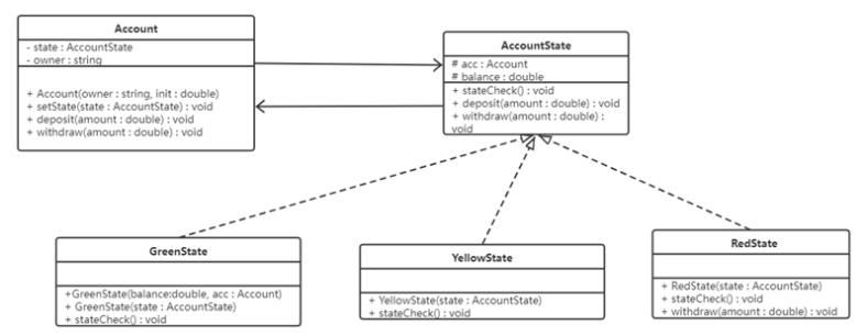 ackage 实验22状态模式; public class ATM { /*所有状态*/ private ATMState readyState; private ATMState noCashState; private ATMState noServiceState; private ATMState currState;//当前状态 private int totalAmount;//账户现钞总数 /*测试用的临时变量*/ private String pwd;//密码 private int balance;//余额 private int amount;//取款金额 public ATM(int totalAmount, int balance, int amount, String pwd) throws Exception{ //初始化所有状态 readyState = new ReadyState(this); noCashState = new NoCashState(this); noServiceState = new NoServiceState(this); if(totalAmount > 0){ currState = readyState; } else if(totalAmount == 0){ currState = noCashState; } else{ throw new Exception(); } //初始化测试数据 this.totalAmount = totalAmount; this.balance = balance; this.amount = amount; this.pwd = pwd; } /*把具体行为委托给状态对象*/ /** * 插卡 */ public void insertCard(){ currState.insertCard(); } /** * 提交密码 */ public void submitPwd(){ currState.submitPwd(); } /** * 取款 */ public void getCash(){ currState.getCash(); } /** * 查询余额 */ public void queryBalance(){ currState.queryBalance(); } /** * 取卡 */ public void ejectCard(){ currState.ejectCard(); } public String toString(){ return "账户总额¥" + totalAmount; } public String SKT() { if(totalAmount >= 0) { return "账户状态为绿色正常状态,既可以存,也可以取款"; } if(totalAmount >= -1000 && totalAmount < 0) { return "账户状态为蓝色欠费状态,既可以存,也可以取款"; } if(totalAmount < -1000) { return "账户状态为红色透支状态,只能存款"; } return ""; } /*此处略去大量getter and setter*/ public String getPwd(){ return pwd; } public int getBalance() { return balance; } public int getTotalAmount() { return totalAmount; } public int getAmount() { return amount; } public void setTotalAmount(int totalAmount) { this.totalAmount = totalAmount; } public void setBalance(int balance) { this.balance = balance; } public ATMState getNoCashState() { return noCashState; } public void setCurrState(ATMState currState) { this.currState = currState; } } package 实验22状态模式; public interface ATMState { public abstract void insertCard(); public abstract void submitPwd(); public abstract void getCash(); public abstract void queryBalance(); public abstract void ejectCard(); } package 实验22状态模式; public class NoServiceState implements ATMState{ private ATM atm;//保留状态持有者的引用,以便对其进行操作 public NoServiceState(ATM atm){ this.atm = atm; } @Override public void insertCard() { System.out.println("插卡失败,机器发生了故障"); } @Override public void submitPwd() { System.out.println("密码提交失败,机器发生了故障"); } @Override public void getCash() { System.out.println("取款失败,机器发生了故障"); } @Override public void queryBalance() { System.out.println("余额查询失败,机器发生了故障"); } @Override public void ejectCard() { System.out.println("取卡失败,机器发生了故障"); } } package 实验22状态模式; public class ReadyState implements ATMState{ private ATM atm;//保留状态持有者的引用,以便对其进行操作 public ReadyState(ATM atm){ this.atm = atm; } @Override public void insertCard() { System.out.println("插卡完成"); } @Override public void submitPwd() { System.out.println("密码提交完成"); //验证密码并做相应处理 if("6300".equals(atm.getPwd())){ System.out.println("密码验证通过"); } else{ System.out.println("密码验证失败"); //弹出卡片 ejectCard(); } } @Override public void getCash() { //atm.getTotalAmount() >= atm.getAmount() && atm.getBalance() >= atm.getAmount() if(atm.getTotalAmount() != 9999){ //更新账户余额 atm.setBalance(atm.getBalance() - atm.getAmount()); //更新机内现钞总数 atm.setTotalAmount(atm.getTotalAmount() - atm.getAmount()); System.out.println("吐出¥" + atm.getAmount()); System.out.println("取款完成"); //弹出卡片 ejectCard(); //检查机内余钞 if(atm.getTotalAmount() == 0){//若无钞,切换到NoService状态 atm.setCurrState(atm.getNoCashState()); System.out.println("无钞信息已经发送至银行"); } } else{ System.out.println("取款失败,余额不足"); //弹出卡片 ejectCard(); } } @Override public void queryBalance() { System.out.println("余额¥" + atm.getBalance()); System.out.println("余额查询完成"); } @Override public void ejectCard() { System.out.println("取卡完成"); } } package 实验22状态模式; public class shijian5_yinhangzhanghu { public static void main(String[] args) { /*测试数据*/ /* 机内总数 账户余额 取款金额 密码 * 1000 500 200 123 * 1000 300 500 123 * 0 500 200 123 * */ try { test(1000, 500, 200, "6300"); System.out.println("------------------------------------------------------------"); test(1000, 300, 1500, "6300"); System.out.println("------------------------------------------------------------"); test(-1500, 500, 200, "6300"); } catch (Exception e) { System.out.println("账户余额小于-1000,账户状态为红色透支状态,请存钱后再取"); //System.out.println("机器故障,维修请求已经发送至维修方"); } } package 实验22状态模式; public class shijian5_yinhangzhanghu { public static void main(String[] args) { /*测试数据*/ /* 机内总数 账户余额 取款金额 密码 * 1000 500 200 123 * 1000 300 500 123 * 0 500 200 123 * */ try { test(1000, 500, 200, "6300"); System.out.println("------------------------------------------------------------"); test(1000, 300, 1500, "6300"); System.out.println("------------------------------------------------------------"); test(-1500, 500, 200, "6300"); } catch (Exception e) { System.out.println("账户余额小于-1000,账户状态为红色透支状态,请存钱后再取"); //System.out.println("机器故障,维修请求已经发送至维修方"); } } private static void test(int totalAmount, int balance, int amount, String pwd)throws Ex