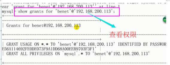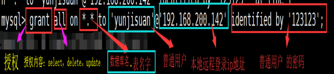 命令: grant all on *.* to 'yunjisuan'@'192.168.200.142' identified by '123123';