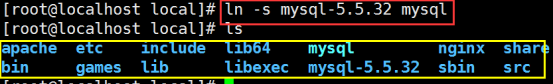 - [root@localhost local]# ln -s mysql-5.5.32 mysql