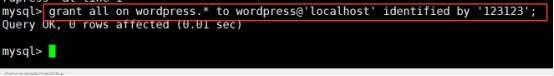 mysql> grant all on wordpress.* to wordpress@'localhost' identified by '123123'; #localhost为客户端地址