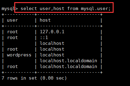 mysql> select user,host from mysql.user; #查看数据库里创建的wordpress用户