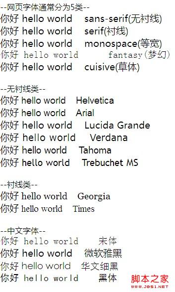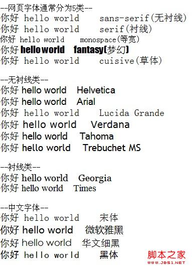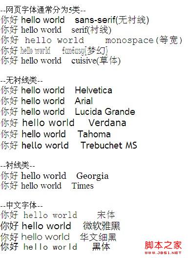 sans-serif(无衬线)类 : Arial; //只要设置成sans-serif类,不管什么字体,都一个样子。