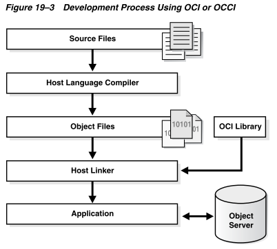 OCI和OCCI提供了一个标准数据库访问和检索函数库,以动态运行时库(OCILIB)的形式存在。这个库可以在应用程序运行时链接。因此,您可以像非数据库应用程序一样编译和链接OCI或OCCI程序,避免了单独的预处理或预编译步骤。图19-3说明了开发过程。
