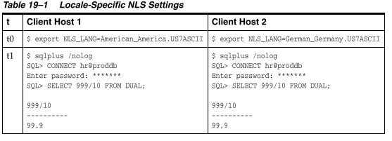 表19-1显示了两个客户端使用不同的NLS_LANG设置。用户在每个主机上启动SQL*Plus,以hr身份登录到同一个数据库,并同时运行相同的查询。由于浮点数的区域特定NLS设置,每个会话的结果不同。