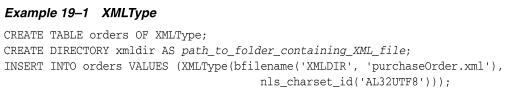 示例19-1创建了一个名为orders的XMLType类型的表。示例还创建了一个SQL目录对象,这是数据库中物理目录在主机计算机上的逻辑名称。这个目录包含XML文件。示例将purchaseOrder.xml文件中的XML内容插入到orders表中。