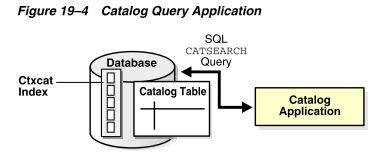图19-4说明了目录表、其CTXCAT索引和使用CATSEARCH操作符查询索引的目录应用程序之间的关系。