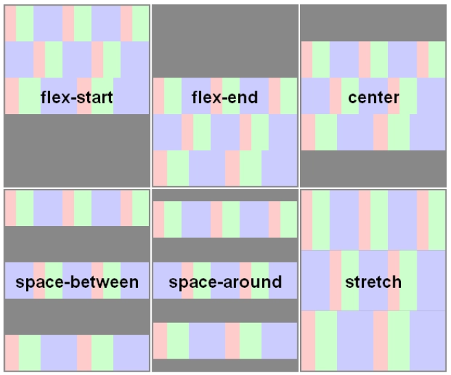 只适用多行的flex容器(子项不止一行时该属性才有效果),它的作用是当flex容器在交叉轴上有多余的空间时,将子项作为一个整体(属性值为:flex-start、flex-end、center时)进行对齐。