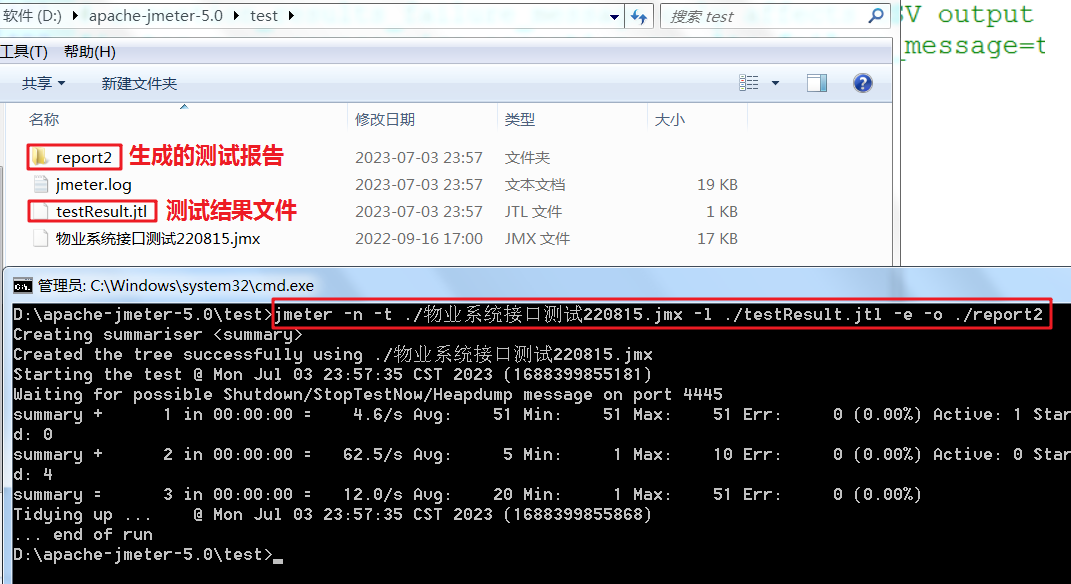 1、输入命令:jmeter -n -t ./物业系统接口测试220815.jmx -l ./testResult.jtl -e -o ./report2
