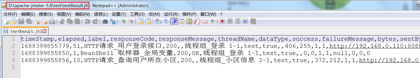 -l:指定测试结果的保存文件,如:jtl文件格式,txt文件格式