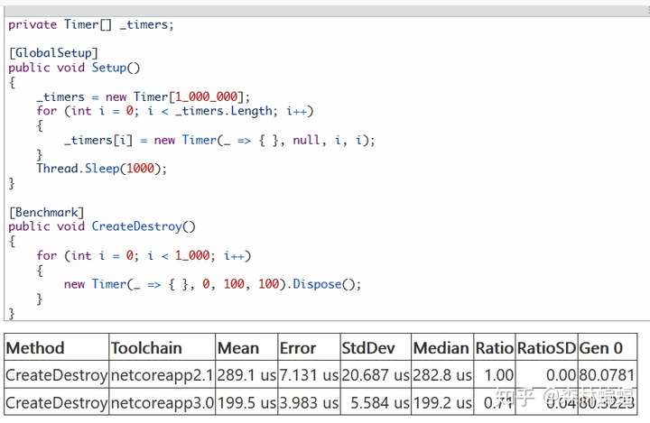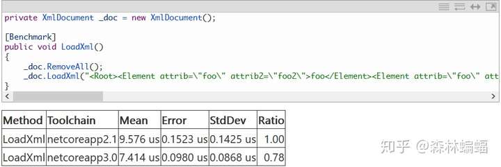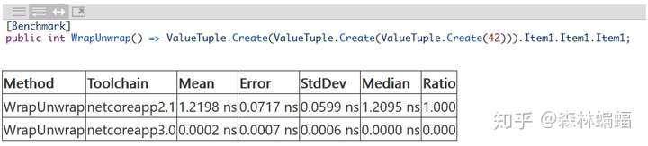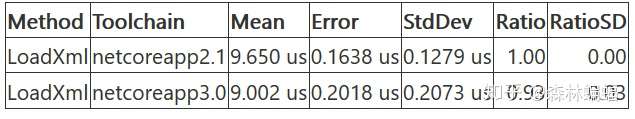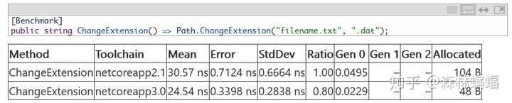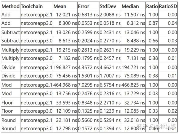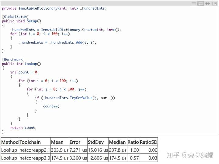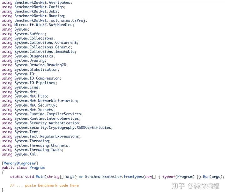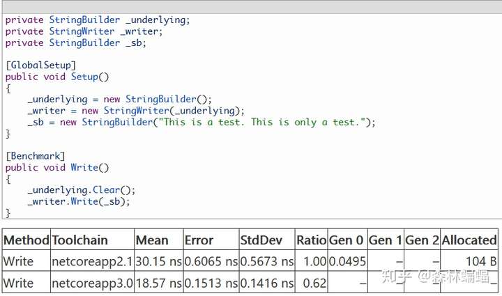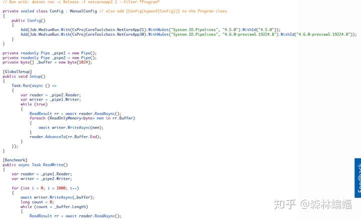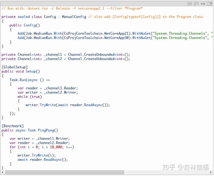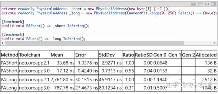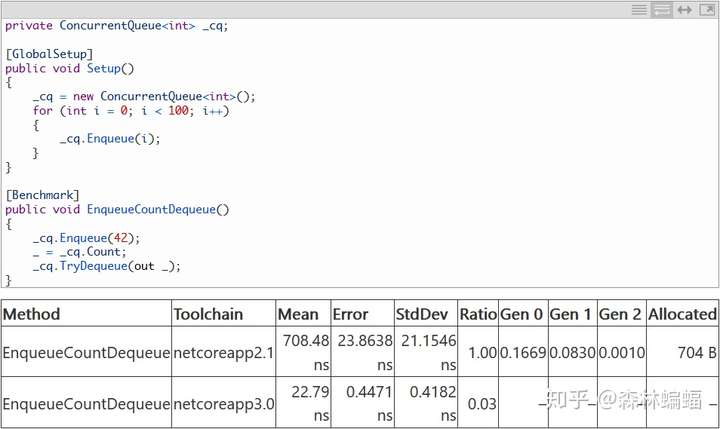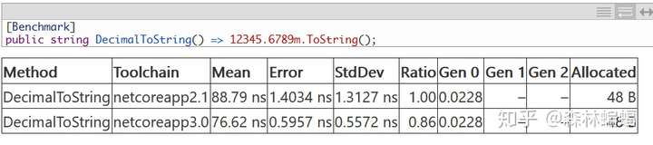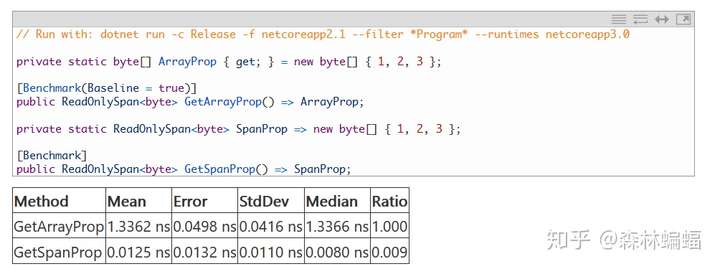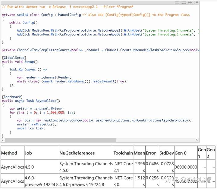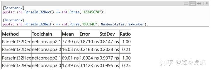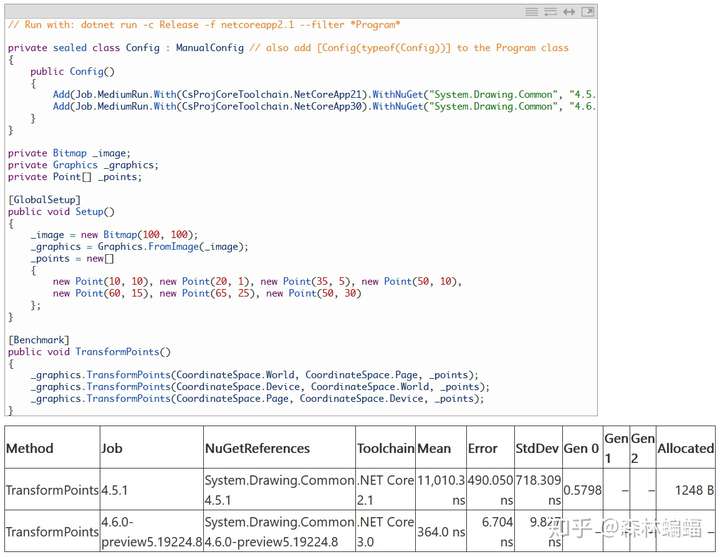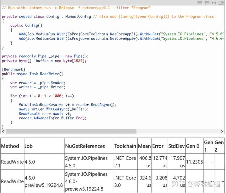 要执行特定的测试,除非另有说明,否则只需要复制粘贴测试代码到上面黄色注释位置,并执行dotnet run -c Release -f netcoreapp2.1 --runtimes netcoreapp2.1 netcoreapp3.0 --filter "*Program*"指令,这会编译和执行2.1和3上两个平台的测试,并且将测试结果打印到一张表中。