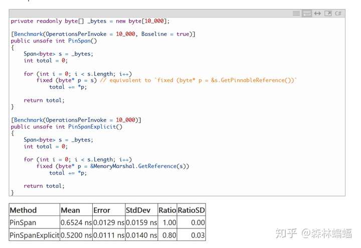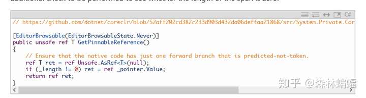 这一点值得注意,如果你对这种微优化感兴趣,你可能避免使用默认的固定,至少是在热点处避免。ReadOnlySpan<T>.GetPinnableReference方法是给数组和字符串的固定而设计的,null或者空输入只会导致一个空指针,这一行为需要进行Span长度为0的非空检查。