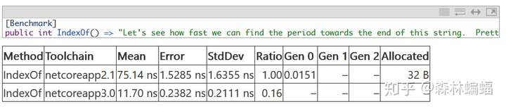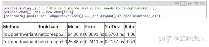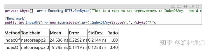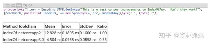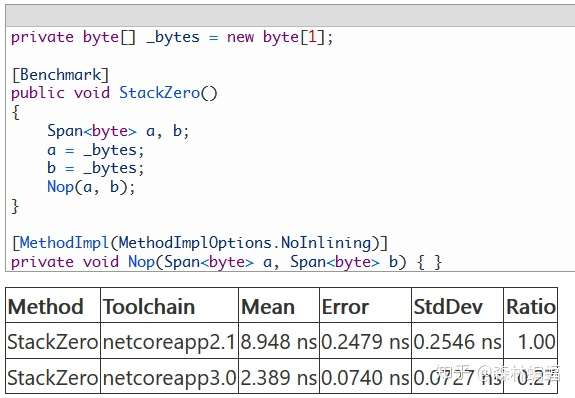 要使用Span工作,应该首先拿到一个Span,已经有几个PR让这一进程加快了(原文and several PRs have made doing so faster)。例如,传递一个Memory<T>然后用它获得一个Span<T>是一种获得Span的常见方法;Stream.WriteAsync和ReadAsync工作的原理是接受一个ReadOnlyMemory<T>(这样ReadOnlyMemory<T>就可以放在堆上),当实际的字节要被读写时进入Memory的Span属性。这个PR移除了一个参数判断分支以提高Span和Memory的性能(包括ReadOnlyMemory<T>.Span方法和ReadOnlySpan<T>.Slice方法),虽然移除一个判断分支是个小事,但是在一堆有着巨量Span的代码中(例如格式化和解析),小优化就可以聚沙成塔。
