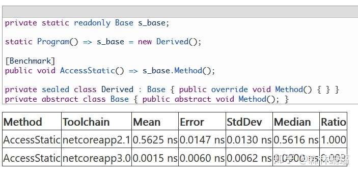 另一个JIT的酷毙提升在这个PR中出现。在以前的.NET中,JIT会把一些static readonly声明的基元类型字段优化成常量,例如一个static readonly int字段被初始化成42,当一些用到了这个字段的代码被JIT编译时,JIT编译器会把这个字段代替成const,并进行常量折叠和其他可能进行的优化。在DNC3中,JIT现在可以应用static readonly字段的类型来做更多优化,例如一个static readonly字段以父类声明,初始化的却是子类(IList<T> list=new List<T>()),JIT可能会查找存储在字段里对象的实际类型,当调用它的虚方法时,“去虚拟化”调用,甚至潜在地内联它。