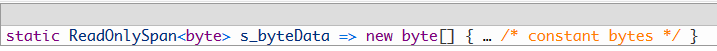 相对于照章编译,每次调用都会分配一个新的字节数组而言,编译器利用了两个特征:a)数组背后的字节都是常量,b)返回了一个ReadOnlySpan,也就是说用户不能用托管代码去修改这个span的数据。通过这个PR,C#编译器取缔了将字节写成二进制大对象放进元数据的做法,这个属性将只会生成一个Span直接指向相应数据,这样访问数据就会极快,甚至比返回一个静态字节数组还快: