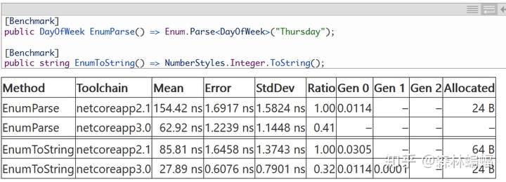 枚举类型在DNC3中也得到了很大的解析和格式化性能改进,这个PR优化了Enum.Parse和Enum.TryParse的处理,不管是泛型还是非泛型的。这个PR优化了[Flags]枚举的ToString方法,而那个PR进一步提升了其他ToString方法。最终Enum相关的性能提升也很大: