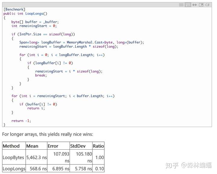 当然,对很小的数组而言它还能有效工作,但是数组大了之后,这么做就会多出很多无用功,考虑到64位处理器会把字节数组重译为long数组,Span<T>对此有很好的支持。我们可以一次比较8个字节而不是一个,以增加代码复杂性为代价:只要我们找到一个非0的long值,我们就可以查看它携带的每一个byte,去找到第一个非0字节(虽然还有方法来改进这个操作)。类似的,数组的长度可能不会正好是8的倍数,所以我们需要处理溢出。