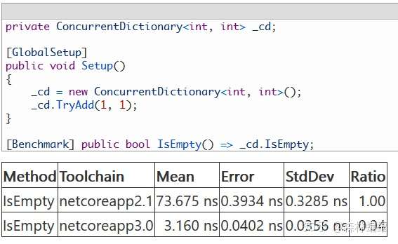ConcurrentDictionary<TKey, TValue>有一个IsEmpty属性,标记了当前状态下,字典是不是空的,在以前的版本中,它持有所有字典的锁来获取即时状态,但实际上,只有我们认为集合可能是空的时候,锁才需要被持有;如果集合的任何内部桶有任何元素,就不需要有锁,而且只要找到一个有元素的散列桶,就不需要查找别的桶。因此,drewnoakes的这个PR添加了一个快速流程,首先检查没有锁的散列桶,来优化字典非空这种普遍情况(字典是空的带来的影响很小)。
